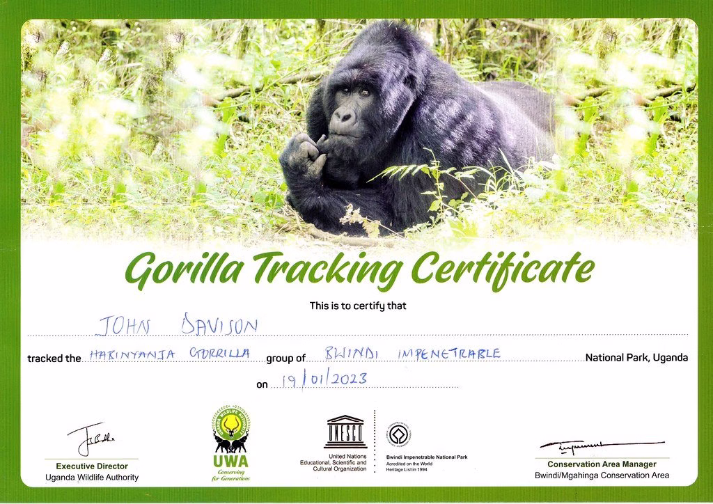 A Gorilla Trekking Certificate is a commemorative document given to trekkers who participate in gorilla trekking in Uganda. It serves as proof of your adventure, marking the time you spent with the endangered mountain gorillas in their natural habitat. The certificate is often provided after you complete your trek, and it typically includes your name, the date of your trek, the name of the gorilla family or group you visited, and the signature of a park official or guide.